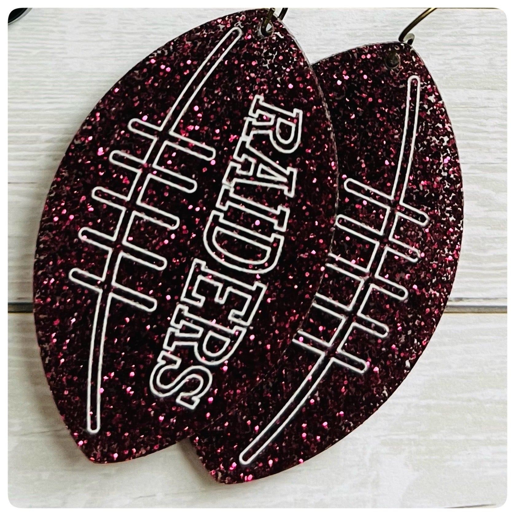 Laser cut cast glitter maroon acrylic; engraved outline and filled with white polymer clay