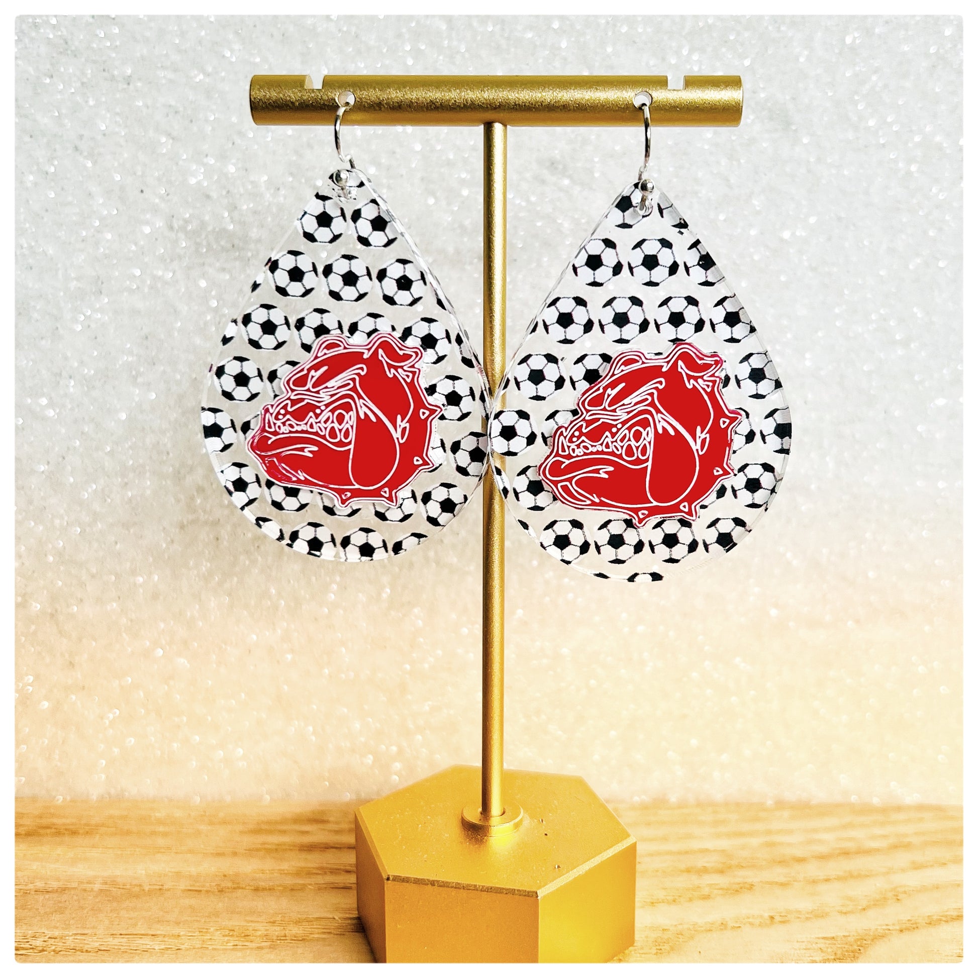 Laser cut cast clear soccer pattern acrylic; red acrylic inlay with white polymer clay filled outline